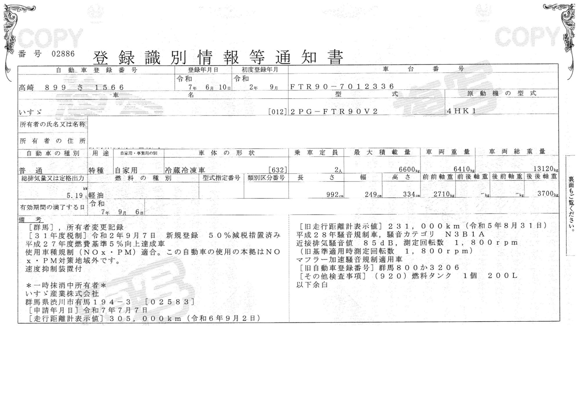 車両型式 | 2PG-FTR90V2 | 車体番号 | FTR90-701**** |