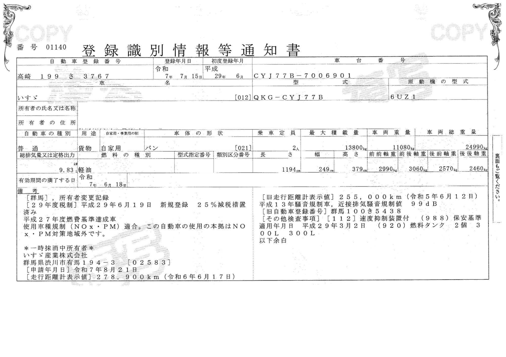| 車両型式 | QKG-CYJ77B | 車体番号 | CYJ77B-700**** |