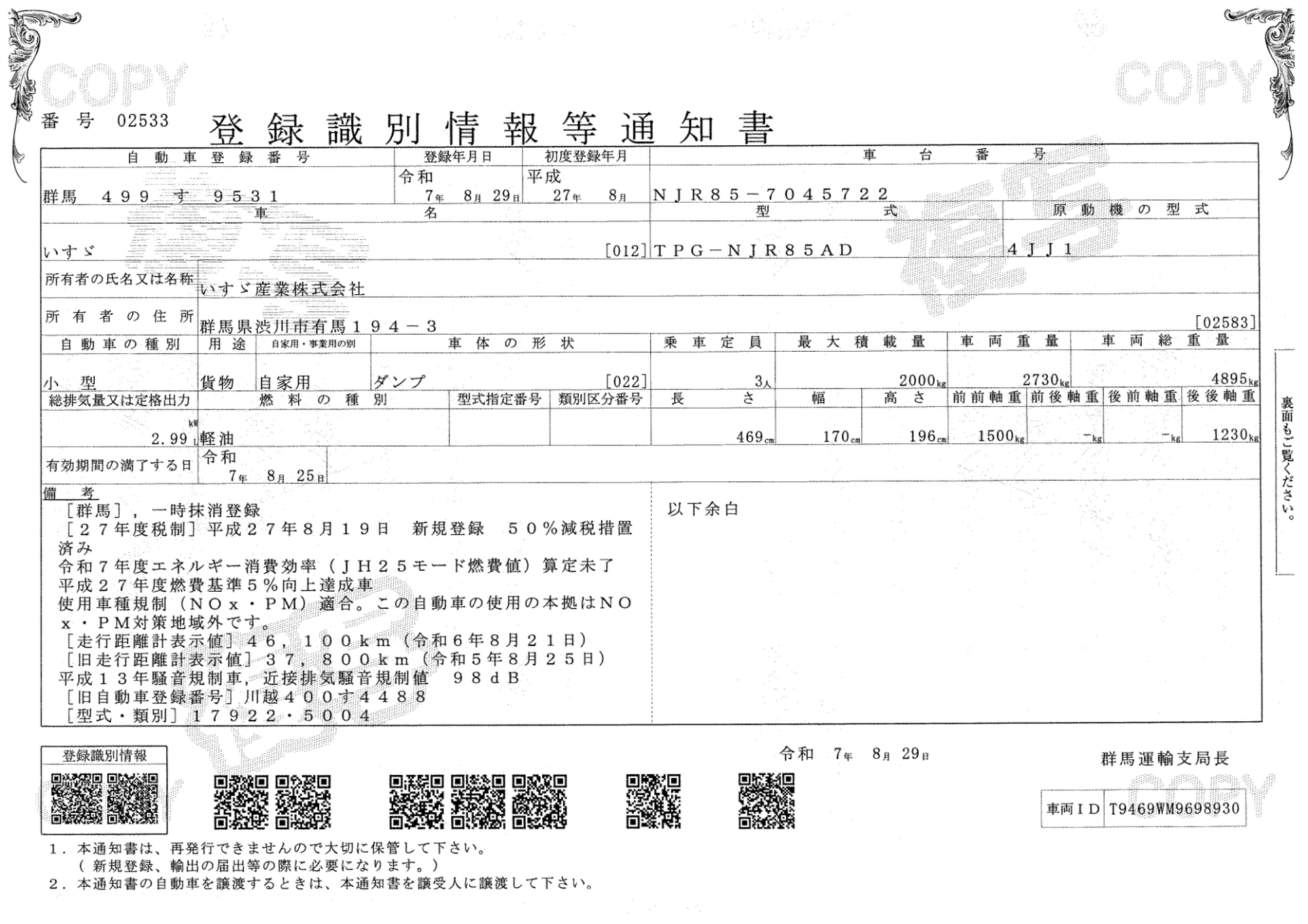 | 車両型式 | TPG-NJR85AD | 車体番号 | NJR85-704**** |