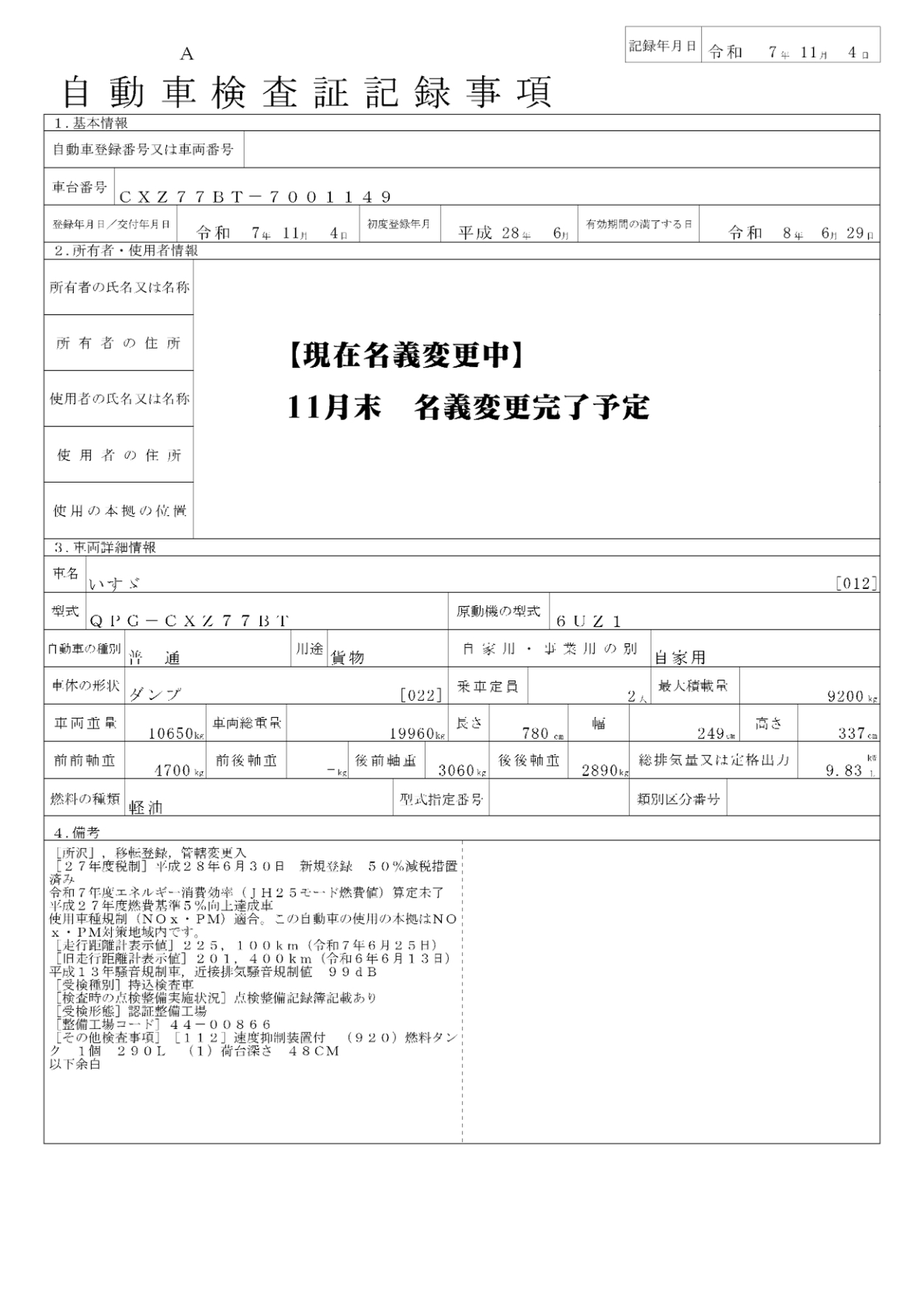 | 車両型式 | QPG-CXZ77BT | 車体番号 | CXZ77BT-700**** |