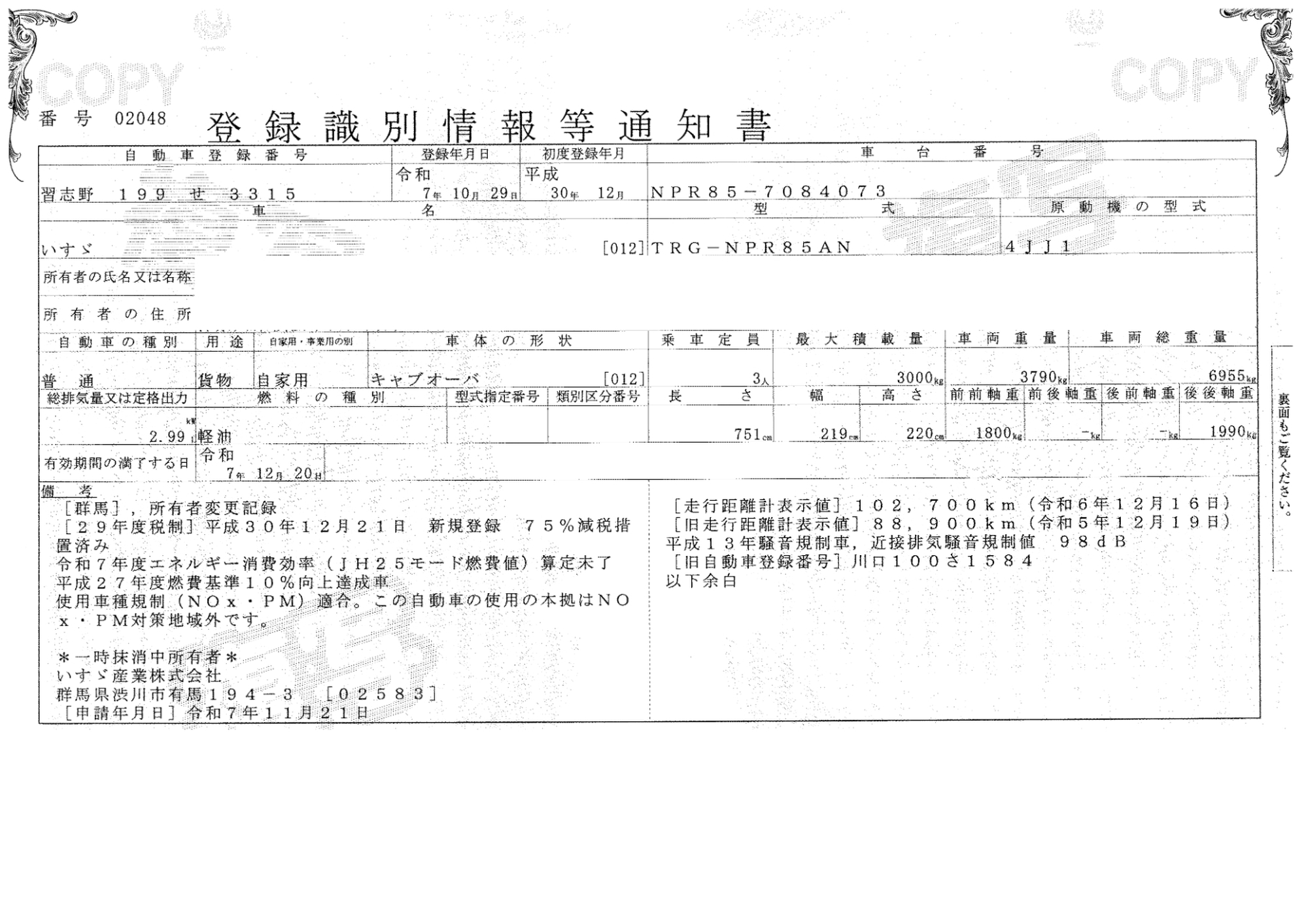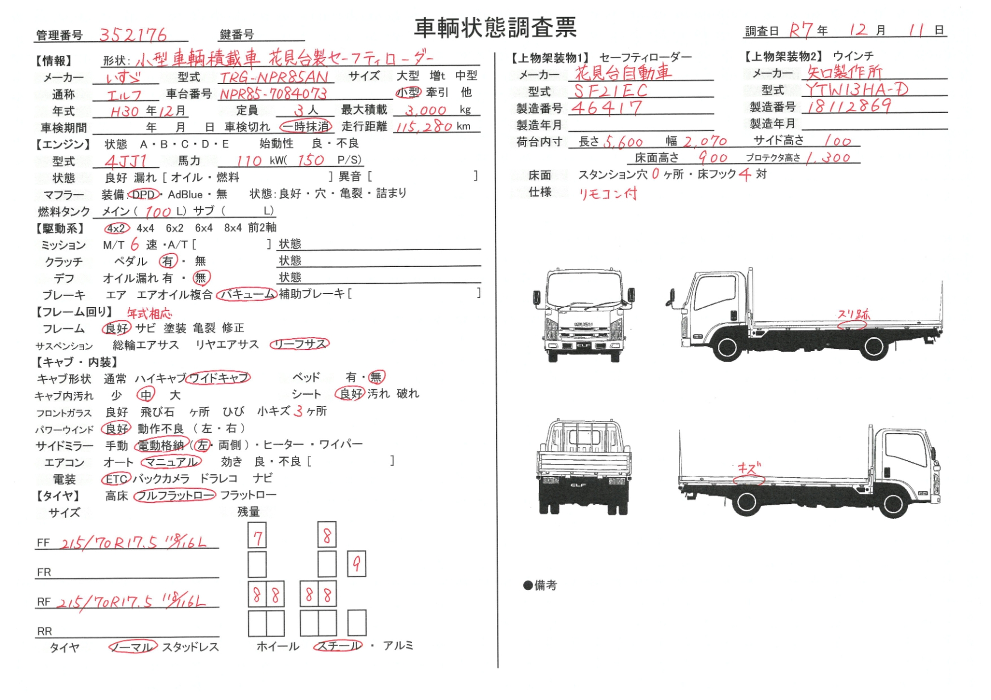 | 車両型式 | TRG-NPR85AN | 車体番号 | NPR85-708**** |