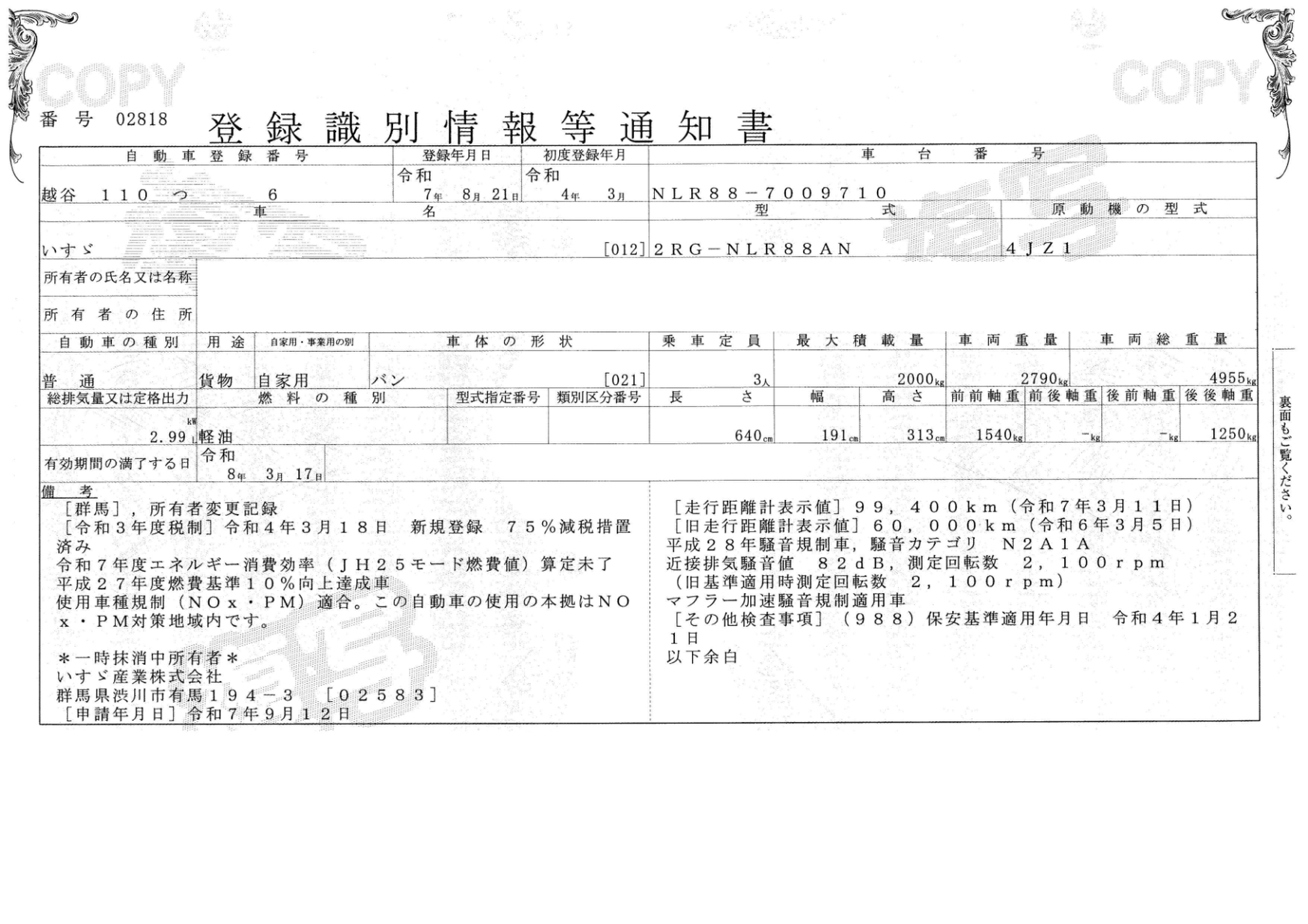 | 車両型式 | 2RG-NLR88AN | 車体番号 | NLR88-700**** |