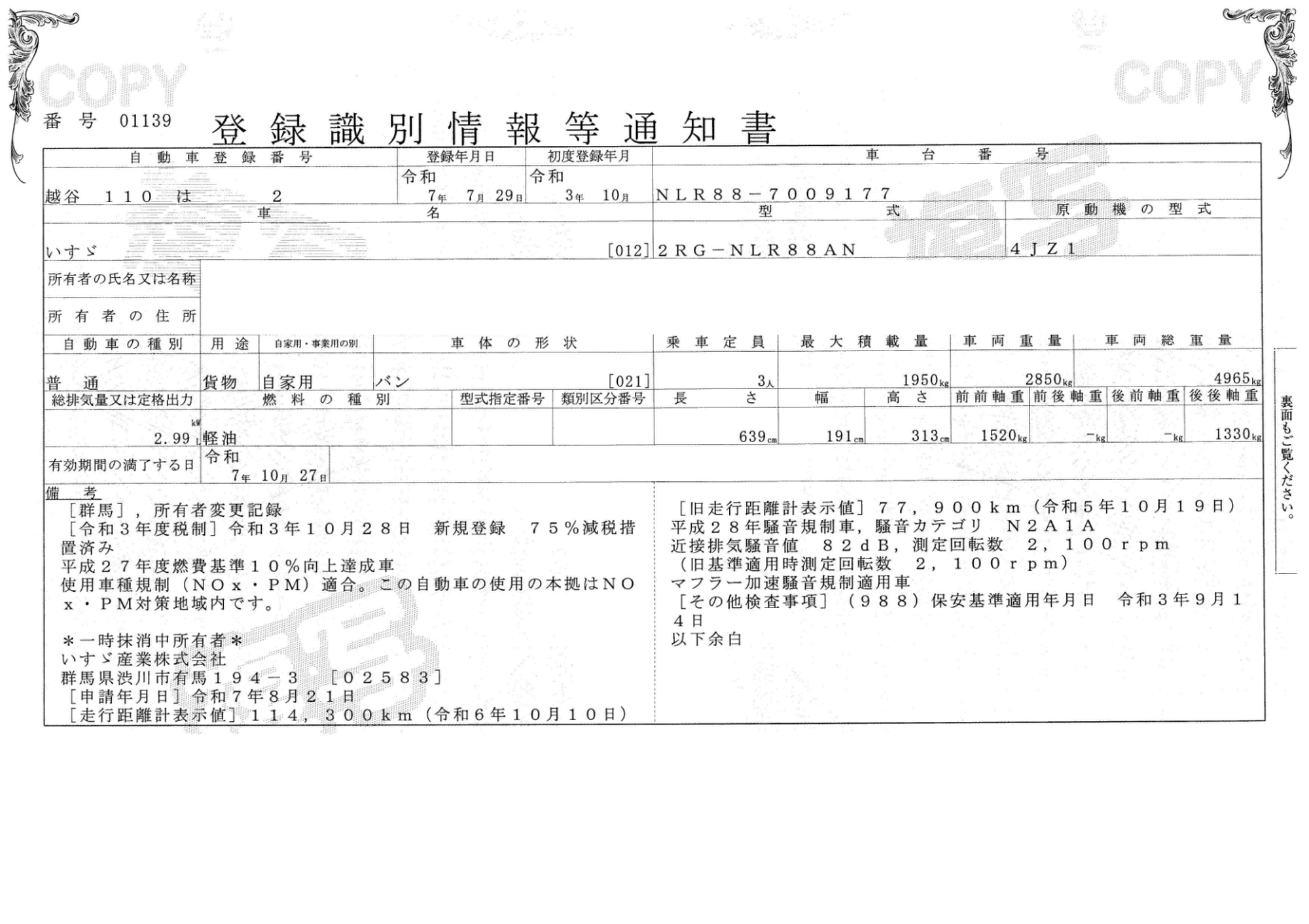 2025(R07) 年 10月 27日 車検証を表示