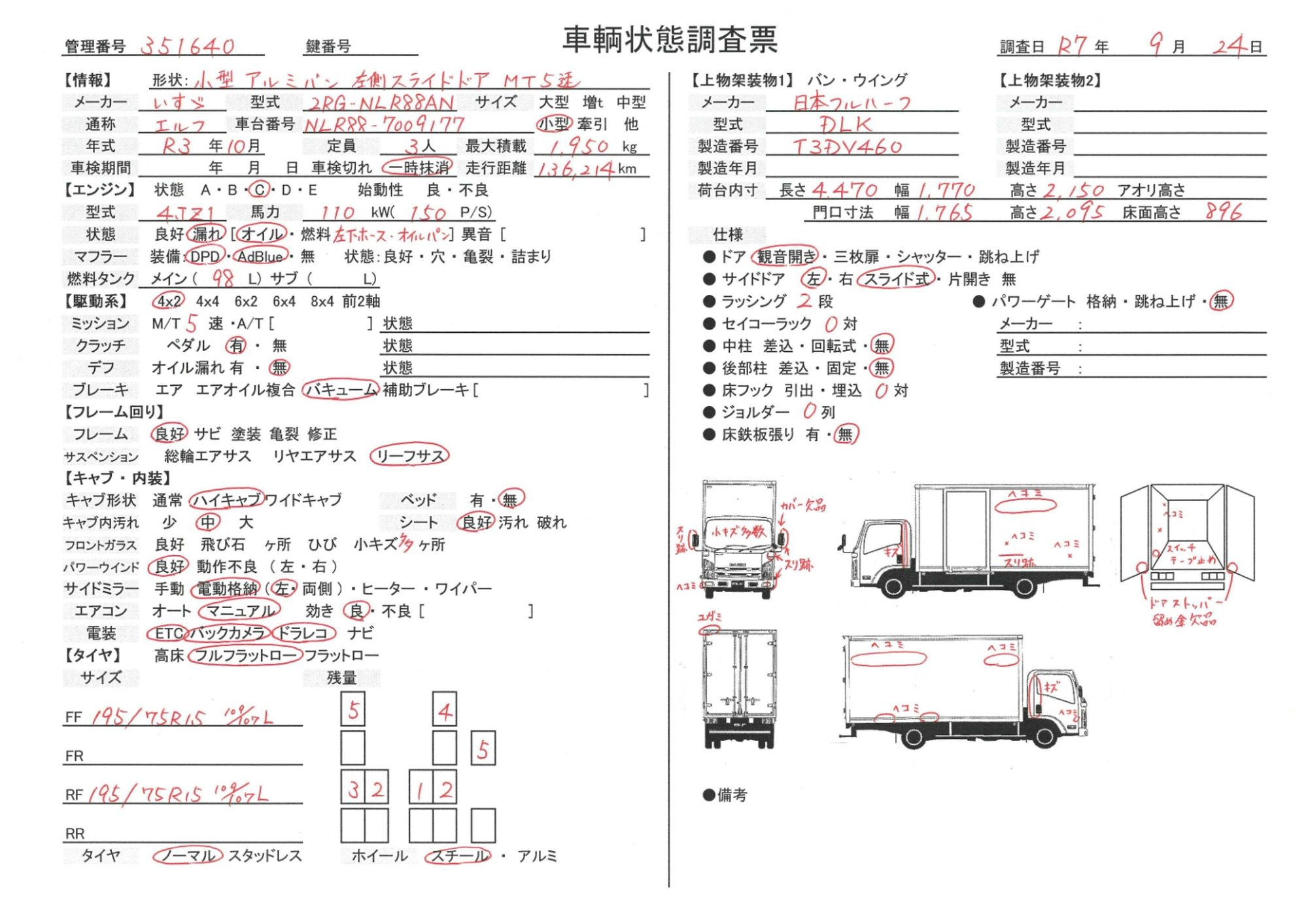 | 上物動作 | 正常 | パワーウィンドウ | 正常 |
