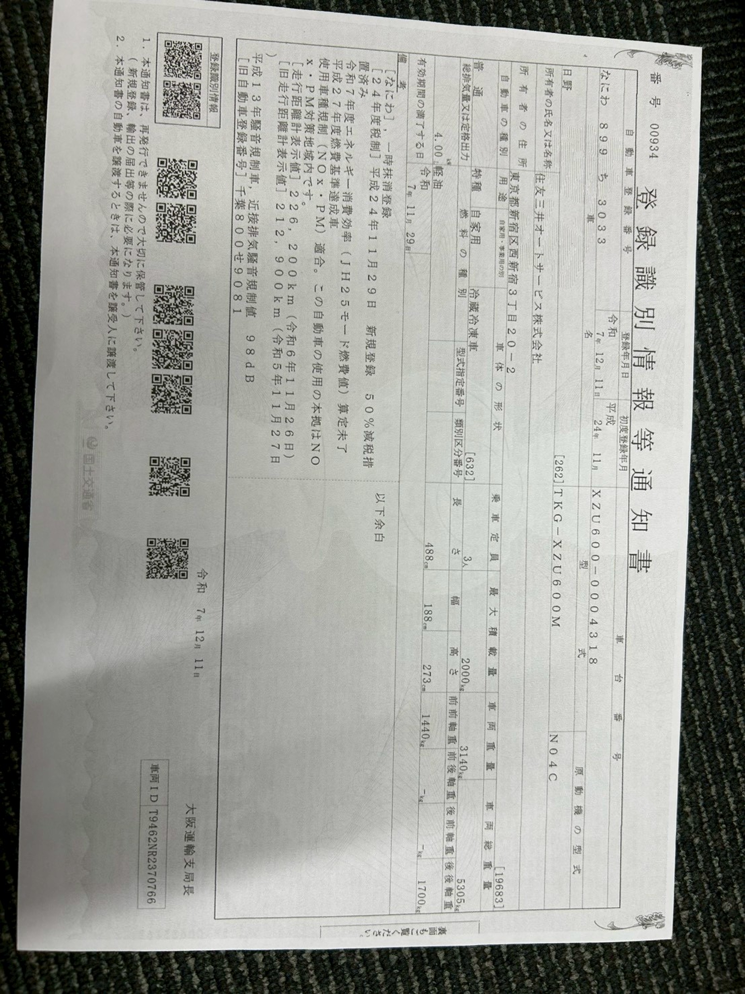 | 車両型式 | TKG-XZU600M | 車体番号 | XZU600-000**** |